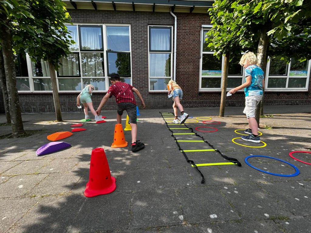 Er gaat gejuich op wanneer de kinderen zien dat er weer een buitenles op het programma staat.. Bewegend leren kan in de vorm van een buitenles, maar het kan natuurlijk ook in een gymlokaal.
